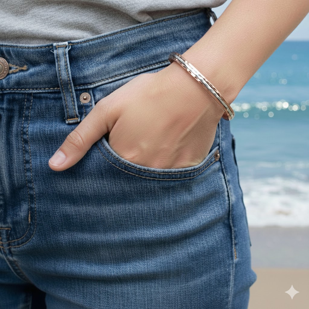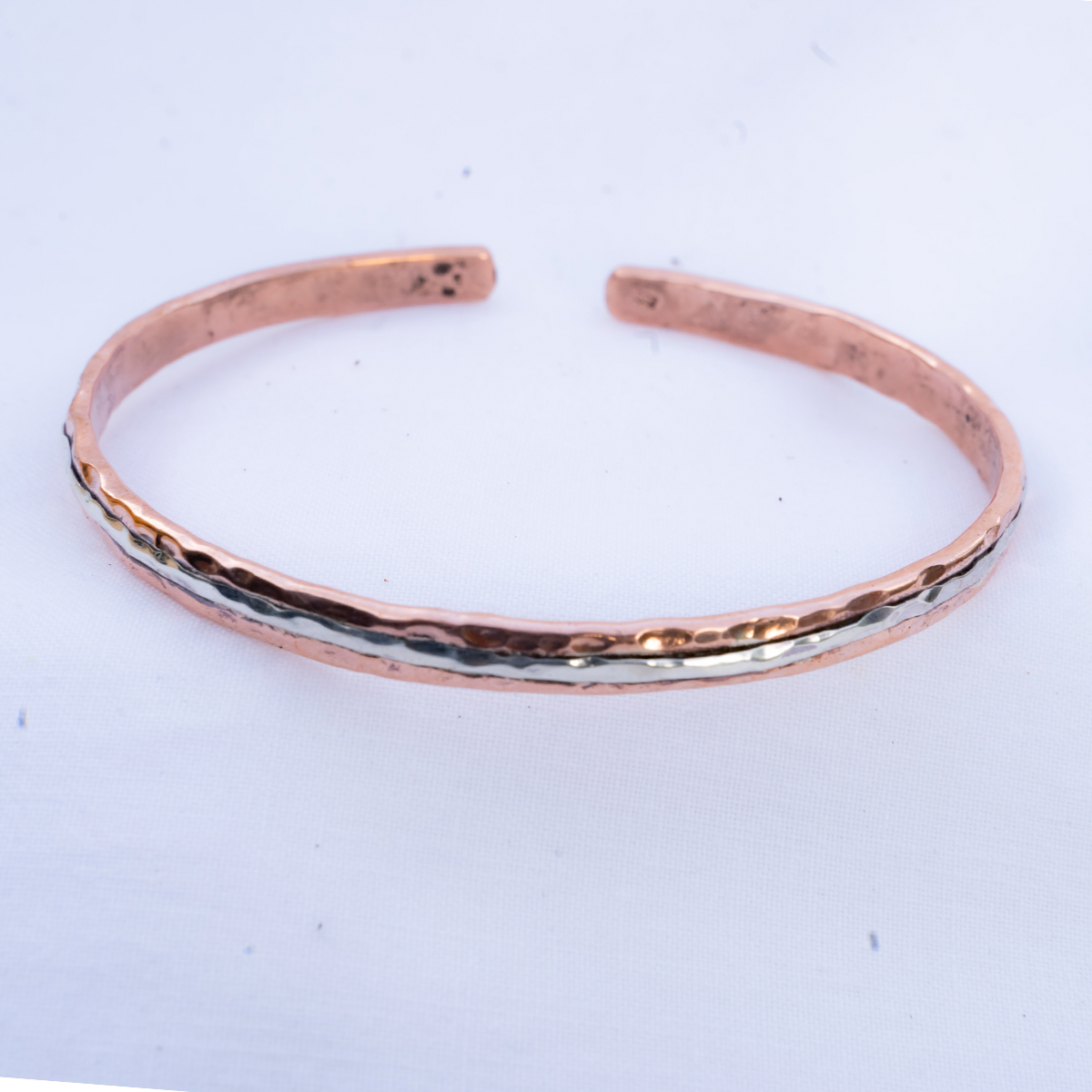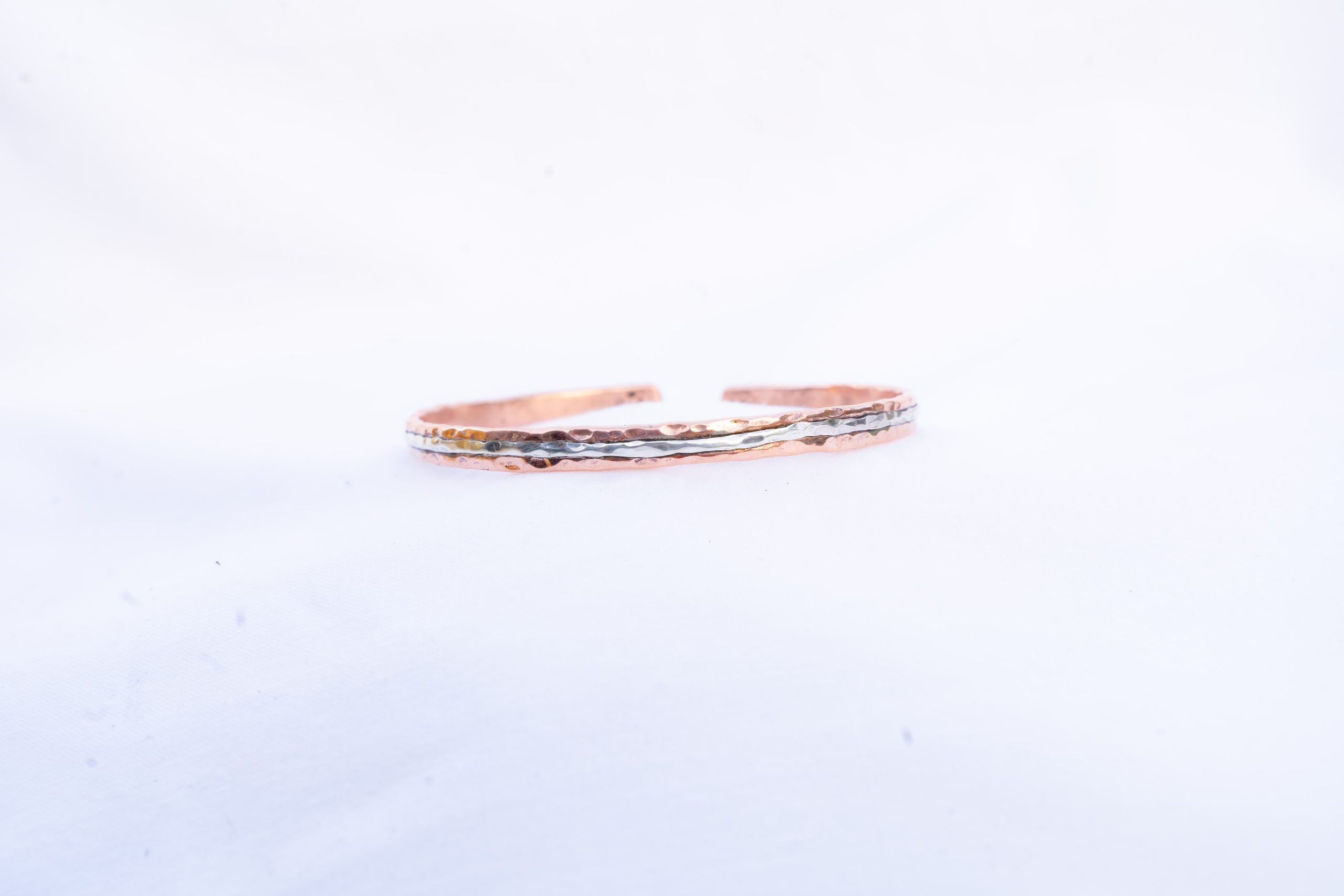 Pulsera bicolor en plata y cobre forjada a mano con tecnicas de martilleado,con las propiedades energeticas que aporta el metal del cobre, una bonita combinacion de colores.