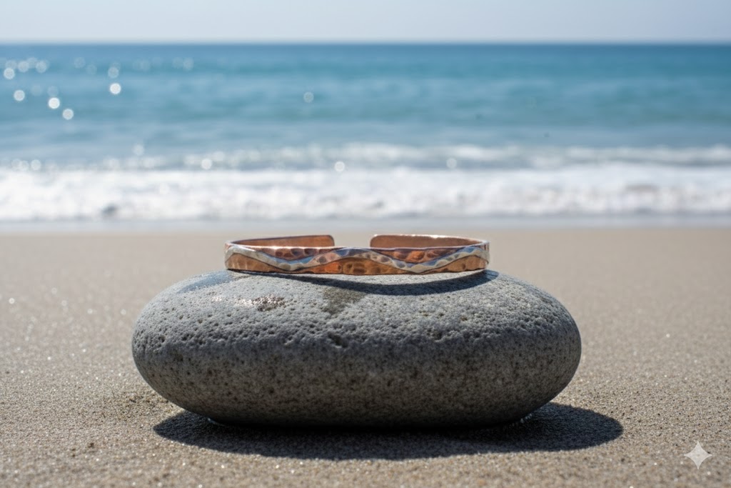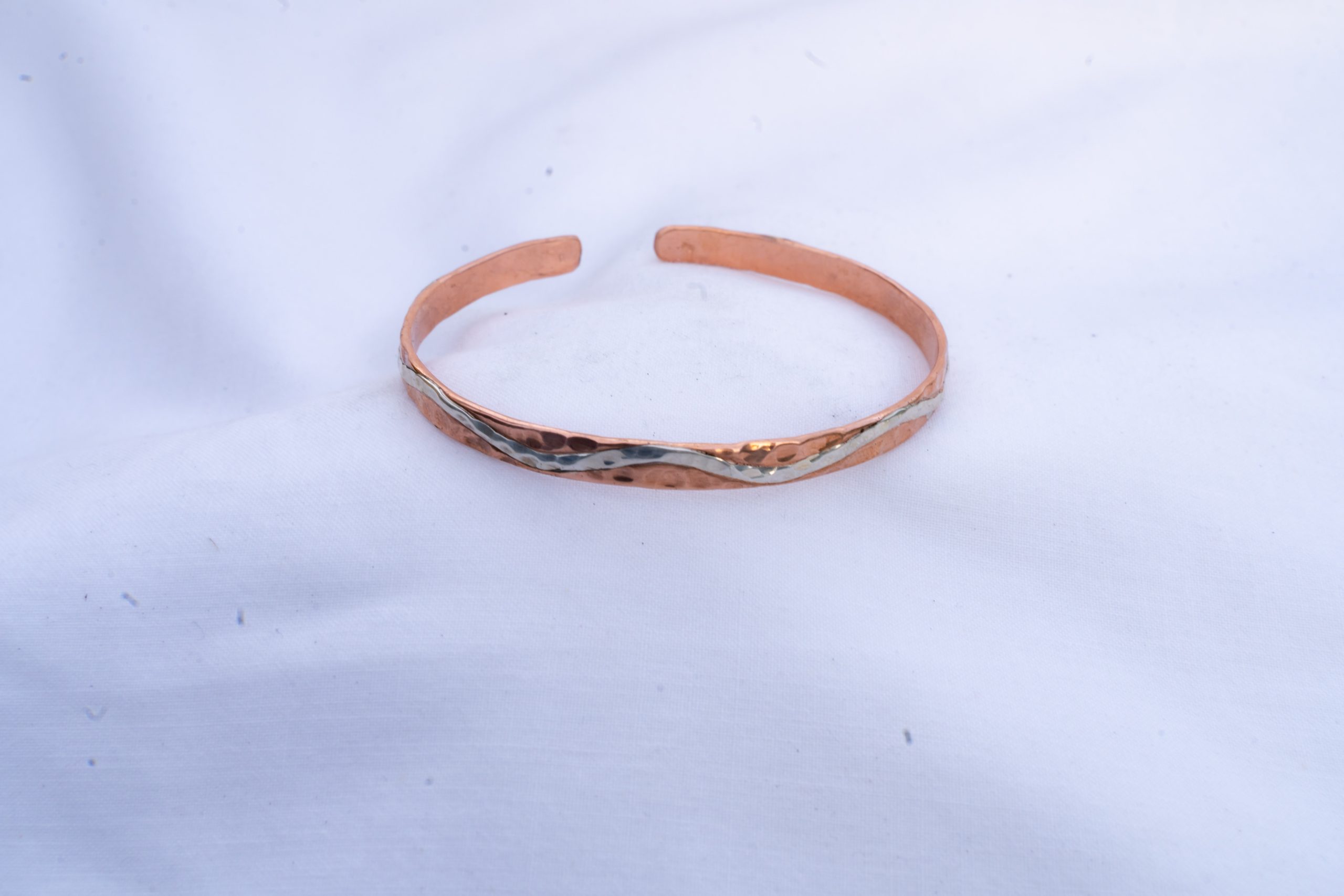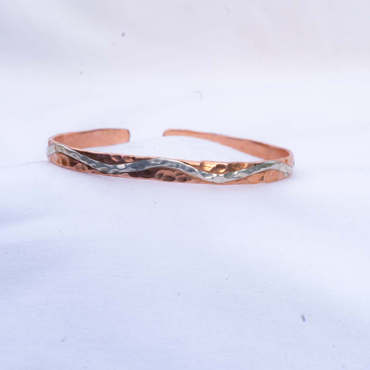 Pulsera bicolor en plata y cobre forjada a mano con tecnicas de martilleado,con las propiedades energeticas que aporta el metal del cobre, una bonita combinacion de colores.