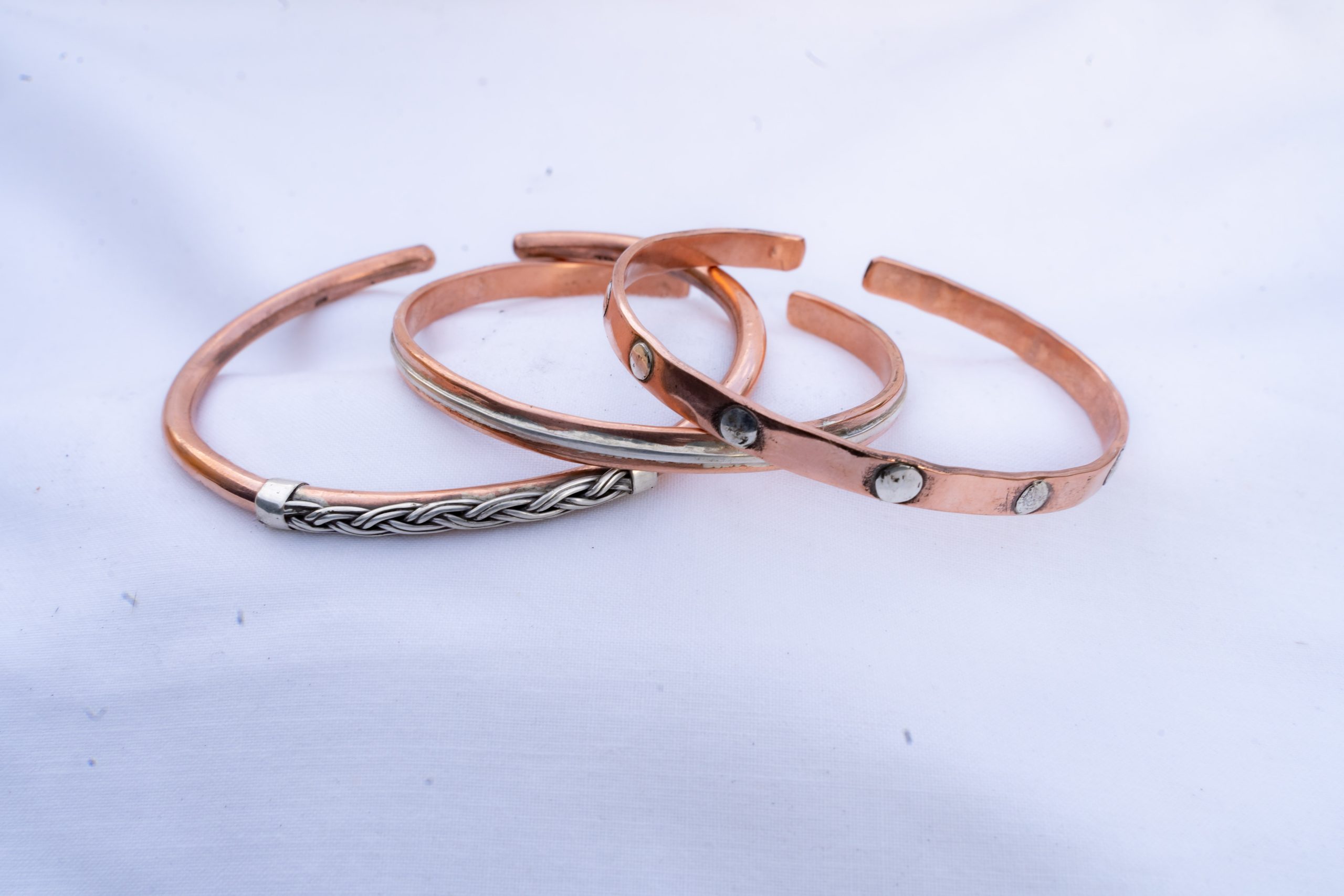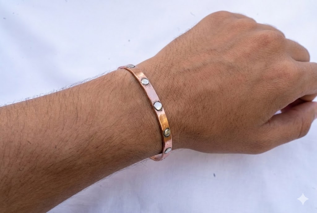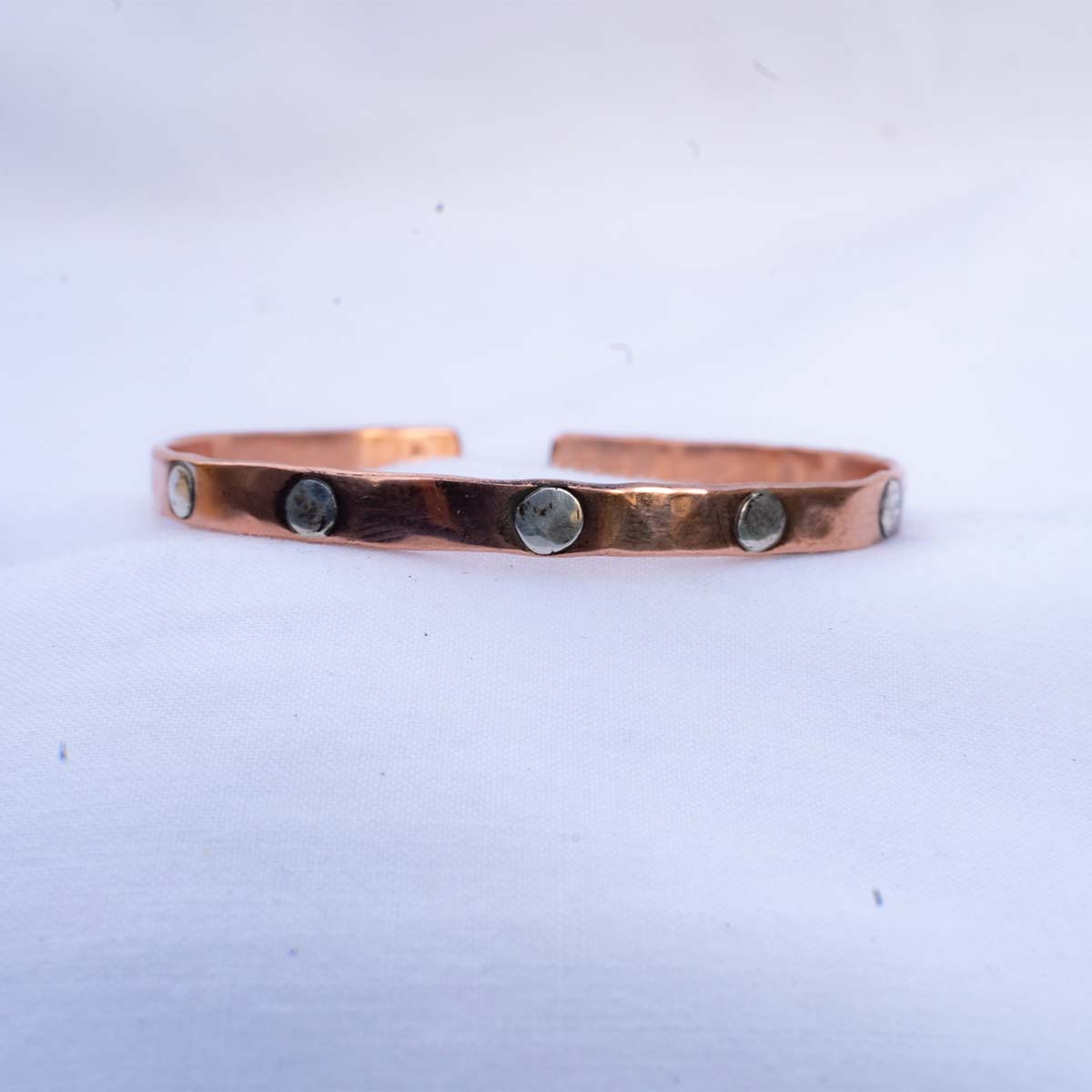Pulsera bicolor en plata y cobre forjada a mano con tecnicas de martilleado,con las propiedades energeticas que aporta el metal del cobre, una bonita combinacion de colores.